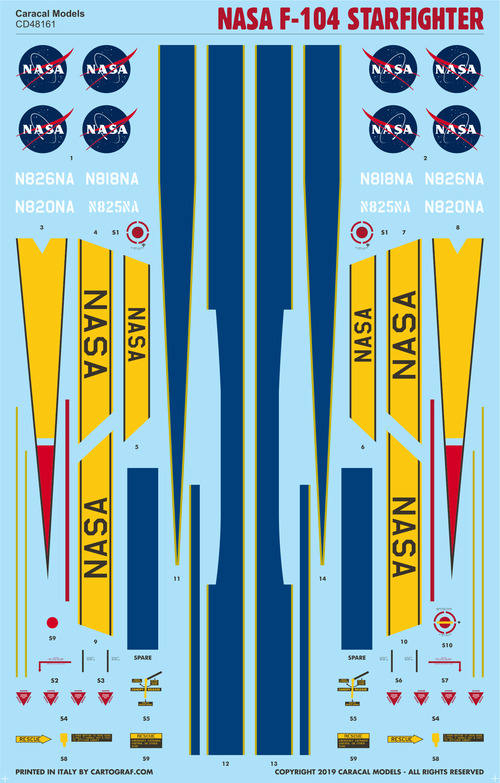 Markings for Nasa F-104A, F-104G and TF-104G Starfighters in both old and newer schemes. While the USAF service of the F-104 has been relatively short, the Starfighter had a long and fruitful service history with NASA. In this decal sheet, we provide markings for Nasa F-104s in both the original 1960s scheme and the later white/blue color scheme.