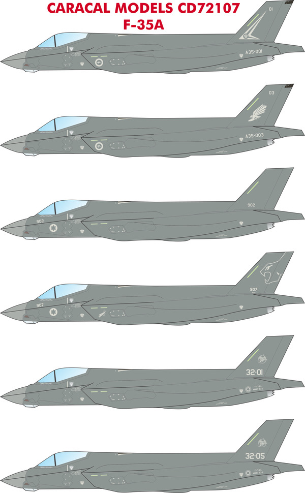 This 1/72 scale sheet for the F-35A features markings for most USAF and foreign current operators of the F-35A as of early 2020.