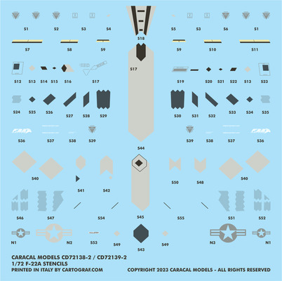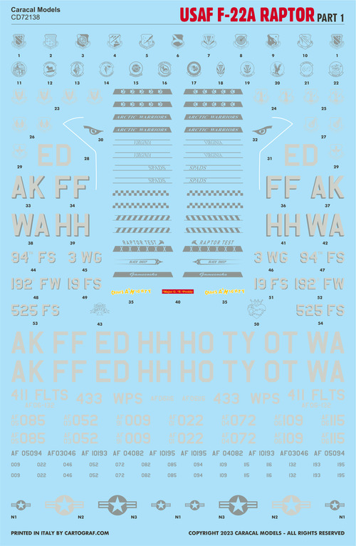 Our first 1/72 scale decals for the F-22 Raptor provide a variety of accurate markings for different units that fly the most advanced fighter in the USAF inventory. We provide options for fourteen (14) USAF Raptors, some with unique nose art or unit flagship markings. Designed for the Hasegawa kit, this decal sheet will work for all dimensionally-correct F-22 kits in 1/72 scale including Revell, Italeri, and Academy kits. The aircraft featured on this sheet are: