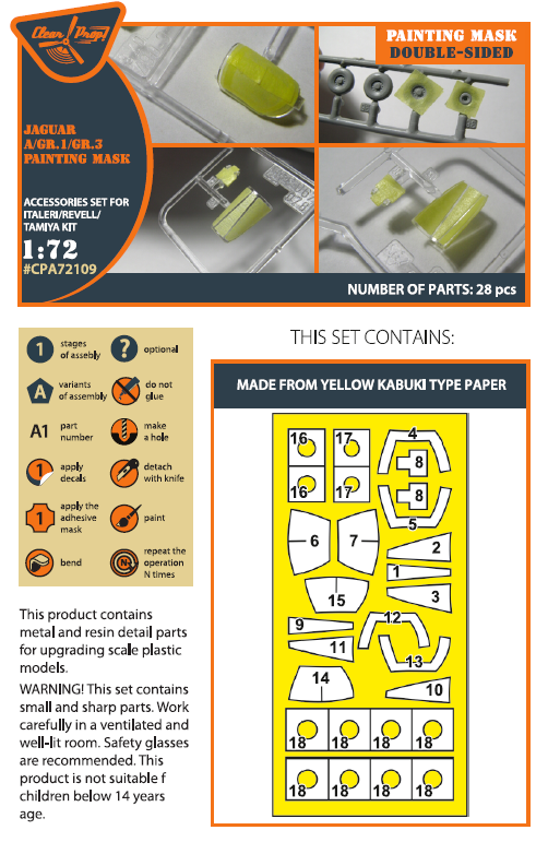 Clear Prop - 1/72 Bac Jaguar A/GR.1/GR.3 painting mask on yellow kabuki paper for designed top be used with Italeri, Revell and Tamiya