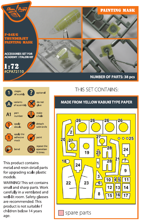 Clear Prop - 1/72 Republic F-84E/F-84G Thunderjet painting mask on 'yellow kabuki paper' for Academy and Italeri