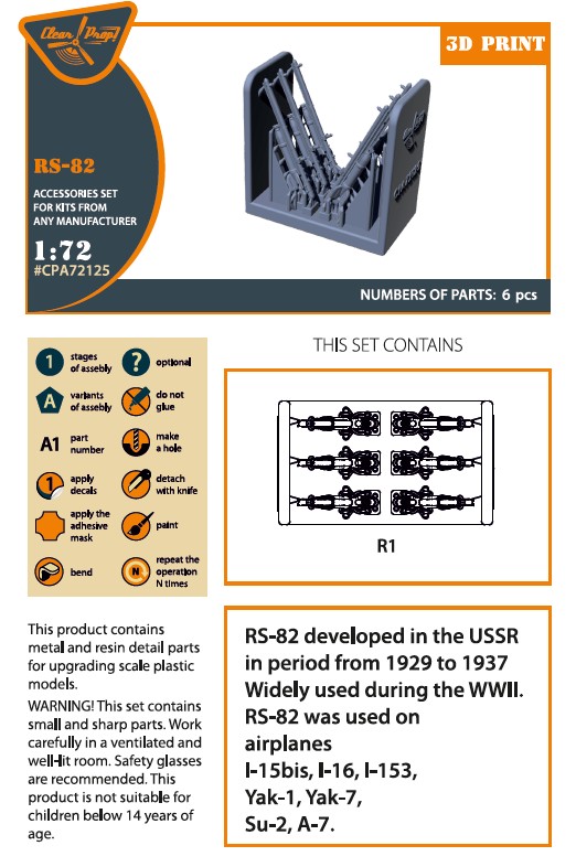 Clear Prop - 1/72 RS-82 unguided missile as used on most Soviet airplanes including : Polikarpov I-15bis, I-16, I-153, Yakovlev Yak-1B, Yak-7, Sukhoi Su-2, Kamov A-7-3A (for A-Model, Arma Hobby kits, Brengun, Heller, Ibg and Smer kits)