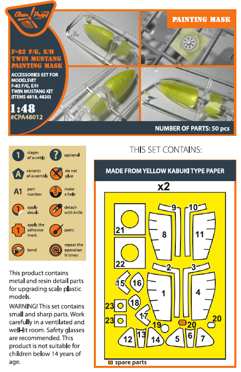Clear Prop - 1/48 North-American F-82F/G, E/H Twin Mustang painting mask on 'yellow kabuki paper' (designed be used with Modelsvit kits) 4818/4820 kits)