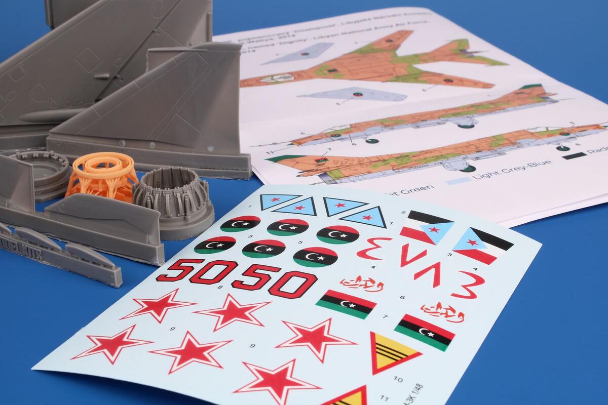 CMK - 1/48 Sukhoi Su-22M-3K Fitter J (Tumansky R-29BS-300 engine) Conversion (for Kitty Hawk Model kits) The Sukhoi aircraft of the Su-17/22 family came out of the production plant with two types of the engine. They could be either fitted with a Lyulka jet of the Al-7F-1 or AL-21F-3 types, or with Tumansky R-29BS-300 power unit which differed in size from the Lyulkas. The 1/48 kit made by Kitty Hawk offers only one variety of the rear fuselage section as used with the AL-21F-3 unit. Not only contians this set the differing rear fuselage, it also contains the differnt vertical tail unit and a sheet of decals covering one Russian and one Libyan airframe.