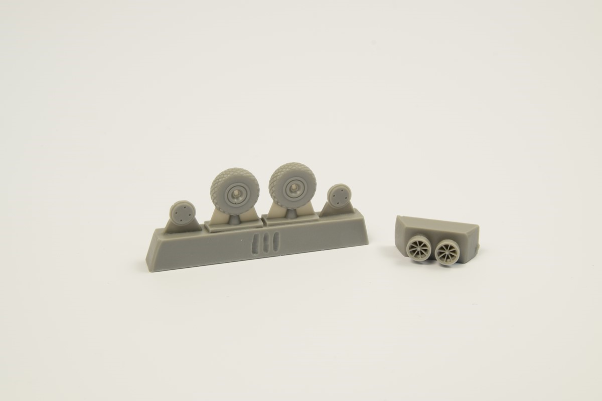 The set contains all new wheels with cross tread tyres, the wheel hubs come as separate casts and the set offers two styles of the wheels, either with the hub covers on or without the covers. 3D designed, 3D-printed master parts. [P-40F/P-40L P-40E P-40N Kittyhawk]
