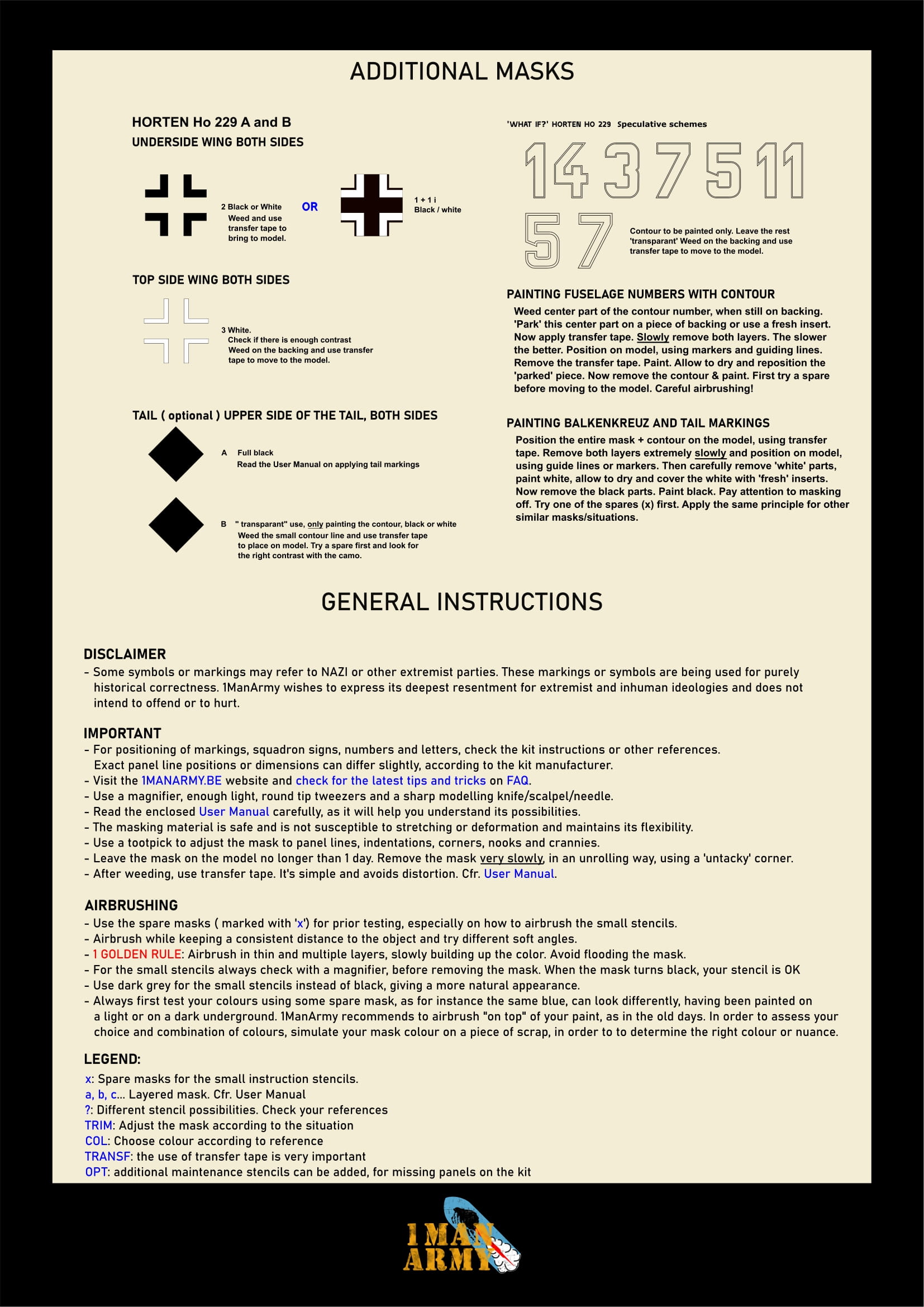 1ManArmy - 1/32 Horten Ho-229A/B contains high definition stencilling and basic national insignia paint masks designed be used with Takom