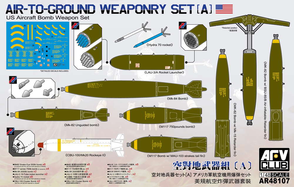 Mk-82 Snake Eye 500lb bomb x8 (3 versions with optional tailfin build open or closed), M117 series 750lb bomb x4 (2 versions), Mk 84 2000lb bomb x2, LAU-3 19-tube rocket launcher x2, Hydra 70 rocket x8 (2 versions with optional tail set), CBU-100/Mk 20 Rockeye II Cluster Bomb x2 (optional tailfin build open or closed). Detailed decal sheet includes stencils & markings.