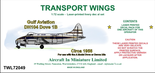 AIM - 1/72 Gulf Aviation de Havilland DH-104 Dove 1B, circa 1956, decal set