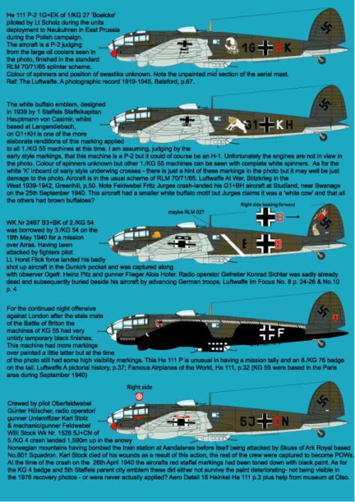 Aims - 1/32 Heinkel He-111P 5 1G+EK of 1/KG 27 Boelcke Poland 1939; G1+KH 1/KG 55 with White Buffalo on fuselage; 5J+CN of 5/KG 4 shot down by Skuas over Norway 1940; White F 8/KG 76 with mission marks along fuselage; B3+BK 3/KG 54 with Rabbit and Bomb carry Raven on fin.