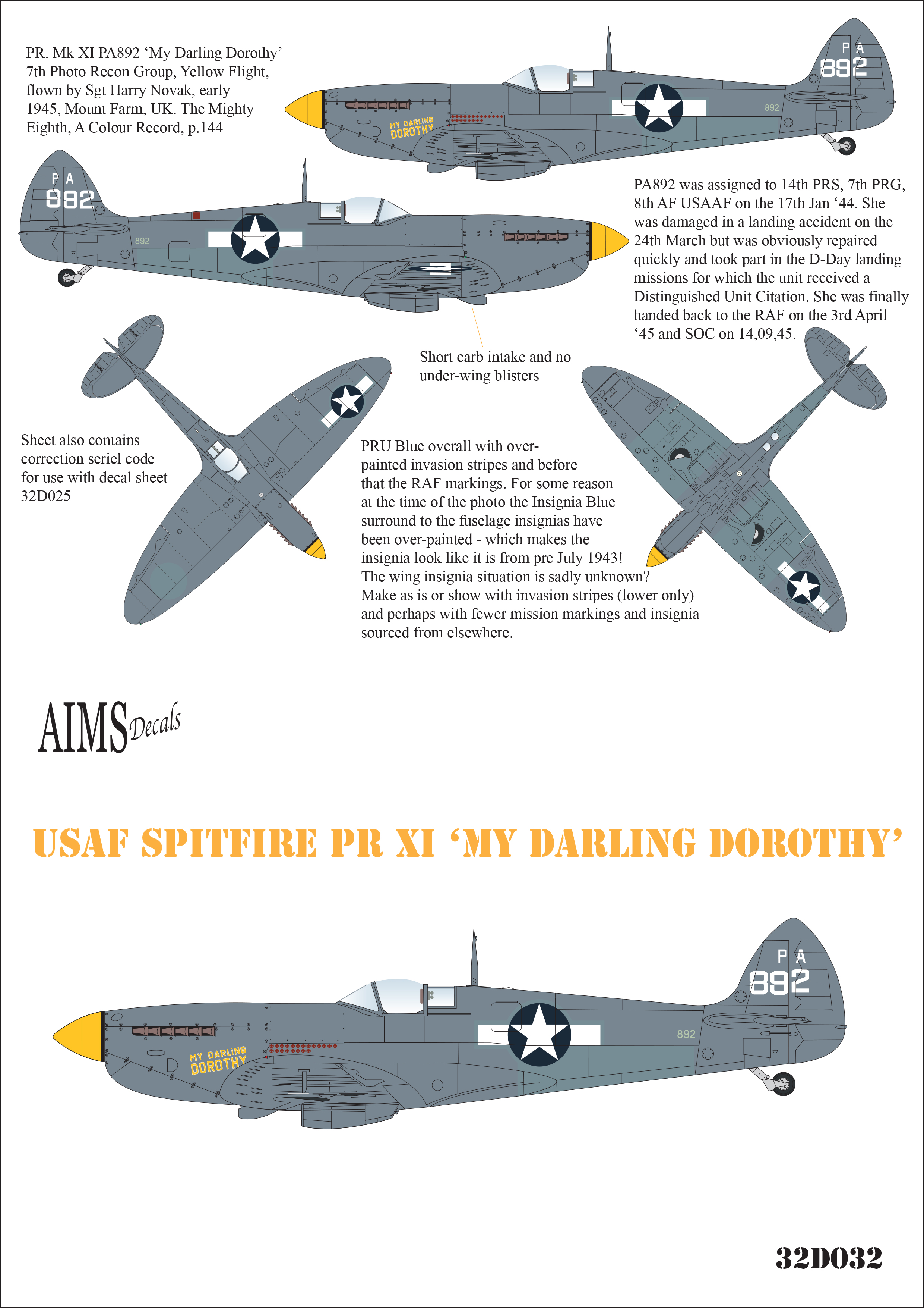 Spitfire Pr Mk.XI PA892 'My Darling Dorothy,' 7th Photo Recon Group, Yellow Flight, flown by Sgt Harry Novak, early 1945, Mount Farm, UK.