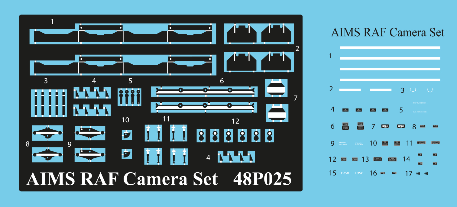 Aims - 1/48 Raf Camera set includes 2x F8's, 2x F24's, 2x F52's, 2x Camera controls, 2x Camera selector boxes, 1x PE, 1x decal slip