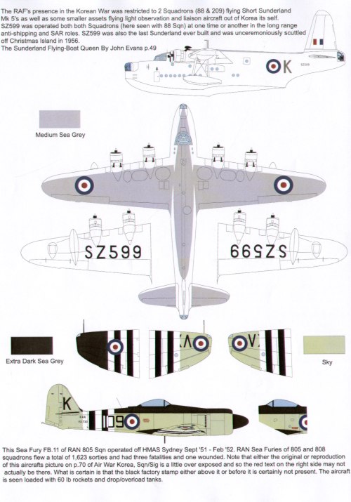 6 North-American P-51D Mustang A68-720 7 Sqn Raaf 1950; No 361 2 Sqn Saaf `Mrs Marlunduchi' K-10 1952; Gloster Meteor F.8 A77-862 77 Sqn Raaf `Duke of Bath'; North-American F-86 614/N 2 Sqn Saaf `Glow Worm' 1953; Hawker Sea Fury FB.11 FB 11 VX730 109/K 805 Sqn Ran Hmas Sydney 1951; Short Sunderland Mk.V SZ599/K 88 Sqn Raf Please note that Gloster Meteor A77-862 should have short engine nacelles not long ones as illustrated and should not have an antenna above the fuselage roundel