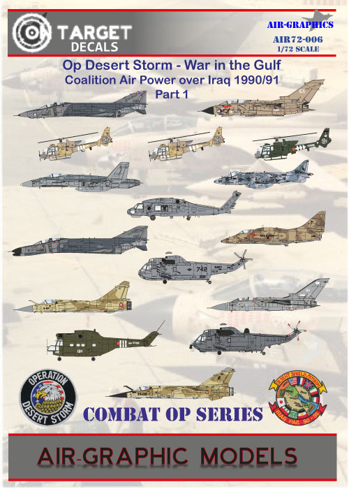Air-Graphic Models - 1/72 Operation Desert Storm Part 1Westland Gazelle AH.1 XX437 C 4 Regiment AACWestland Gazelle AH.1 ZB691 Y 4 Regiment AACPanavia Tornado GR.1 ZA447/EA Mig Eater, Xv Squadron Raf Based at TabukPanavia Tornado F3, ZE986/DJ, 11 Squadron Raf Based at Dharan Sikorsky S-70B-2 Seahawk, N24-004/73, Situ (HS-816), Ran aboard Hmas SydneyBoeing CF-188A Hornet, 188741, 441 Squadron The Desert Cats, Canadian Armed Forces, (CAF) QatarCH-124A Sea King, 12412, 443 Squadron, CAF, Operation FrictionSH-3G Sea King, 15139/742, HC-2 Desert Duck Airlines, USNMcDD AV-8B Harrier II, 163673/00, VMA-231 Ace of Spades, Usmc Based at Al JubailMcDD F-4G Phantom, 69-7212/SP, 81st TFS/52 Tfw Wild Weasels USAF Based at Sheikh IsaMcDD RF-4C Phantom, 65-0886/, 192 TRS/152 Trg High Rollers, USAF Based at Sheikh IsaDouglas A-4KU Skyhawk, 801 of 9/21 Squadron Free Kuwait Air Force, DhahranDassault Mirage 2000C 5-OP/74 of Escadron de Chasse 2/5 lle-de-France French Air Force Based at Al Asha (Desert Camo Scheme)Dassault Mirage F1CR 33-CG/629 of Escasron de Reconnaissance 1/33 Belfort French Air Force Based at Al Ahsa (Desert Camo Scheme)Aerospatiale SA-330 Puma Ade 164, Escadrille dHlicoptres de Manoeuvre (EHM 6/1) Buffalo 16 Arme de Terre (French Army)Aerospatiale SA-341M Gazelle Bpd 82 of 5e Rgiment dHlicoptres de combat (5e RHC) Arme de Terre (French Army)