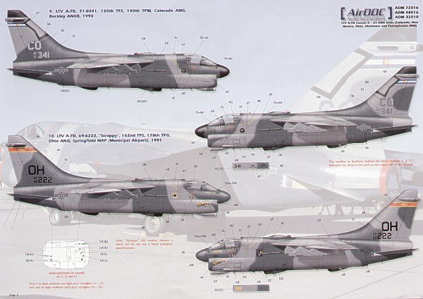 Airdoc - 1/32 Ltv A-7D Corsair Ang 12 72-0996 120 TFS/140 Tfw Colorado Ang 1978; 70-1039/TL 125 TFS/138 Tfg Oklahoma Ang 1977; 72-0225 and 72-0237 188 TFS/150 Tfg New Mexico Ang 1979; 74-1742/PT 146 TFS/112 Tfg Pennsylvania Ang Pittsburgh Iap 1983. 72-0244/CO 120 TFS/140 Tfg Colorado Ang .All Sea camouflage. 71-0324 188 TFS/150 Tfg New Mexico Ang 1984; 70-1028/OK Oklahoma Ang 1985; 70-1049/PT 146 TFS/112 Tfg Pennsylvania Ang 1983. All European 1 camouflage. 72-0243 and 71-0341/CO 120 TFS/140 Tfw Colorado Ang 1990; 69-6222/OH 162 TFS/178 Tfg Ohio Ang `Scrappy' The Yoxford Boys