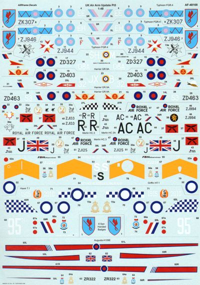 Airframe - 1/48 Uk Air Arm Update Part 5 2010 (12) BAe Harrier GR.9 (3) ZD327 JX-B/32 1(F) Sqn 2010, ZD463/52 800 Nas 2009, ZD327 SH-M/08A Commander D.Lindsay 800 Nas at Riat 2010. All Joint Force Harrier Raf Cottesmore, BAe Hawk T.1A XX324 Wg/Com Brian R. Braid 19 Sqn 95th Anniversary Raf Valley 2010, BAe Typhoon FGR.4 (3) ZK307EE 6 Sqn Flt/Lt J. Woodward 2010, ZJ946/EH 6 Sqn 2010 Raf Conningsby/RAF Leuchars, ZJ944/F 1435 Flight Raf Mount Pleasant Falklands 2009, Westland/Augusta Merlin HC.3A (3) ZJ994/AC 2010, ZJ133/R Splat 2008, ZJ125/J 2008, All 28(Army C0-0-eration Sqn Raf Benson, all overall Nato green, Bell Griffin HT1 ZJ234/S Defence Helicopter Flying School Riat 2010, Augusta A.109E ZR322 32 Sqn Raf Northolt 2010
