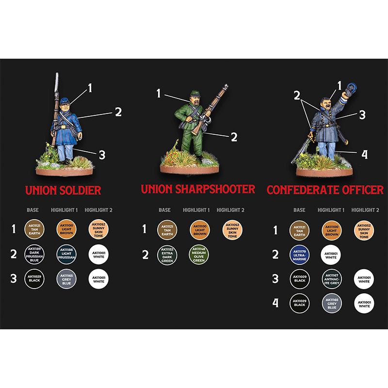 this set contains a selection of shades to paint miniatures from the american civil war, both north and south.