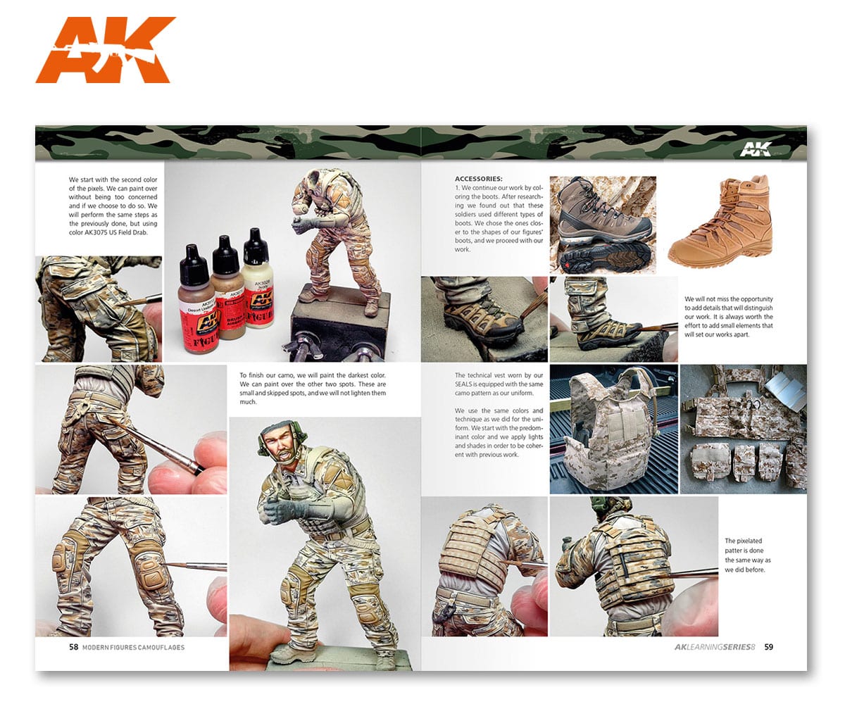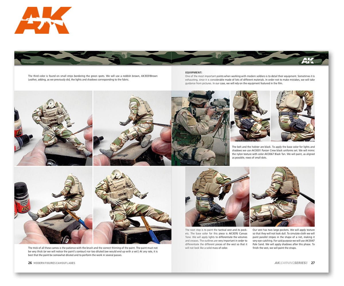 Issue number 8 of the well-known Learning Series collection focuses on figure painting, in this manual you will find all the information, tricks and secrets related to modern camouflage painting. Different types of figures in different scales in which the artists apply different styles and techniques to show different ways to achieve the best results in the figures. This book is profusely illustrated with step-by-step photos and descriptive text that explain the secrets of these uniforms.