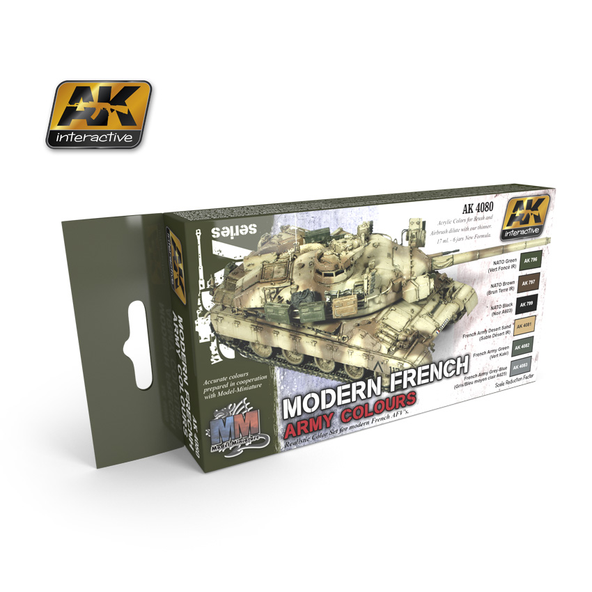 AK Interactive - MODERN FRENCH ARMY COLOURS This set of six acrylic paints is essential for painting the vehicles used by the French Army from the 1950s until today. These acrylic paints are formulated for both brush and airbrush use, and they are soluble in water, meaning that you won't have odours as you would experience from the more aggressive, solvent-based paints. The acrylics are manufactured by AK-Interactive, and are made to the own formula, which prevents problems with them drying in the airbrush, causing potential blockages. We recommend using AK712 Acrylic Thinner for best results. A profi le guide is printed on the reverse of the box.