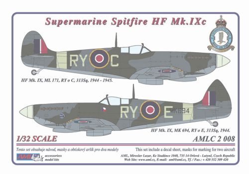 AML - 1/32 Supermarine Spitfire Mk.IXC 2 decal versions : RY-C , RY-E. Includes decals for 2 aircraft. National Insignia and Canopy paint masks