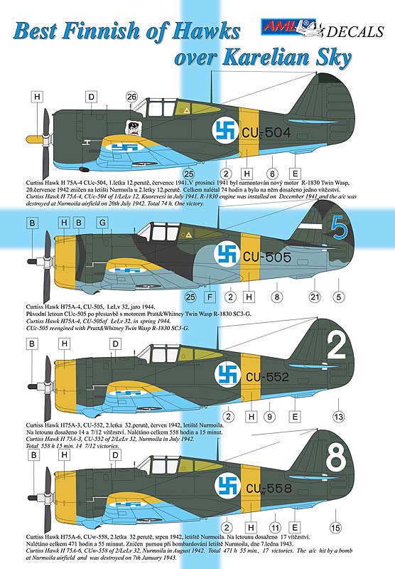 AML - 1/72 Finnish Curtiss-Hawk H-75 Hawks (over Karelian Sky 6) CU-504, CU-505/5, CU-552/2, CU-553/3, CU-558/8, CU-560/0 Olive green and olive green/dark green camouflage schemes with yellow trim