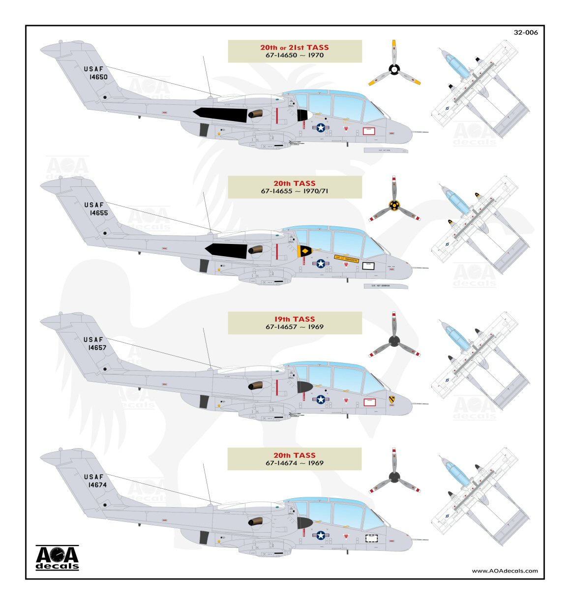 AOA Decals - 1/32 North-American/Rockwell OV-10A Broncos (USAF Vietnam War) This 1/32 decal sheet includes 16 marking options for OV-10A Broncos used by the USAF in the Forward Air Controller (FAC) role during the Vietnam War. Unfortunately not all schemes included are identified to their applicable assigned Tactical Air Support Squadron (TASS). Although not illustrated, one aircraft (67-14623) can also be modeled as a PAVE NAIL aircraft since the markings were the same before/after modification. Instructions also include ordnance loadout charts. Full stencils are provided for one OV-10, however, the stencils provided are complete airframe stencils. The stencil sheet is also available to purchase separately (see 32-007).