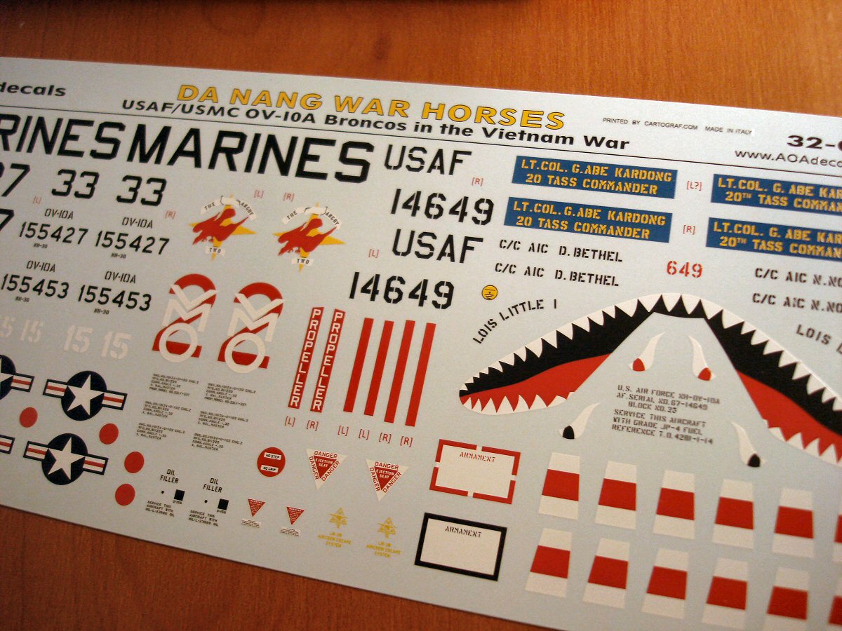 AOA Decals - 1/32 USAF & USMC North-American/Rockwell OV-10A Broncos (Vietnam). This small 1/32 decal sheet includes two Marine VMO-2 aircraft, one from 1969 and the other from 1970, and the USAF 20th TASS CO's "famous" shark-mouthed Lois Little, which can be depicted from different time periods in 1972 (although a third option is also possible). Important note: Departing from previous AOA releases, this sheet will NOT include complete airframe stencils, instead only the larger common markings are provided. For those modelers that wish to have entire airframe stencils, the full stencils are available separately, see AOA32005 (USMC) and AOA32007 (USAF).