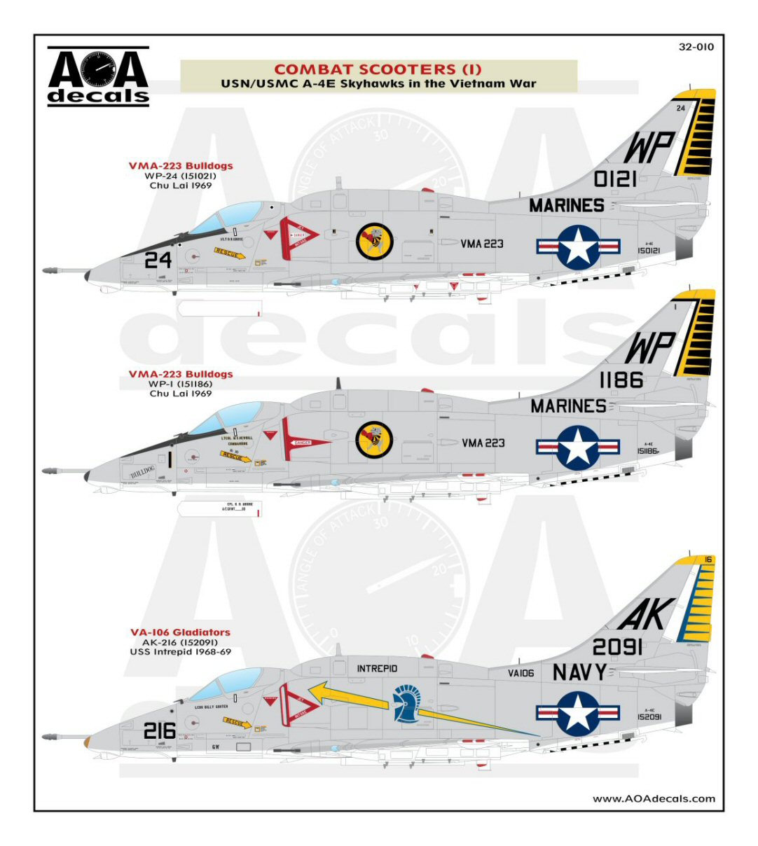 AOA Decals - 1/32 Combat Scooters (1) - USN/USMC Douglas A-4E Skyhawks in the Vietnam War. This Part 1 decal sheet focuses on three A-4E Skyhawk squadrons in the Vietnam War. Typical for AOA's coverage of Vietnam USN/USMC aircraft, this sheet also provides the modeler with the choice of time periods for a specific squadron, and in the case of the A-4, also a choice of aircraft with and without the later avionics hump. An exception unfortunately is VA-106, with only their second/final Vietnam cruise included (their first was the ill-fated USS Forrestal 1967 cruise). The Trumpeter A-4F kit includes VA-94 decals of the CAG's "BOBBIE" aircraft from the 1970 USS Bon Homme Richard cruise and incorrectly identifies the aircraft as an A-4F when it was actually an A-4E. Since the kit decals are also very inaccurate (size, shape, colors, etc), the same scheme is provided on this AOA sheet that much more closely represent the actual markings carried. The same CAG aircraft can also be represented with this sheet when it wore somewhat different markings from the previous 1969 cruise. The VMA-223 fuselage bulldog insignia is nearly always shown in illustrations and in previous decals with significant black outlining and details, presumably due to basing the appearance on more modern VMA-223 examples and/or squadron patch detail. However, the original sprayed on Vietnam-era period bulldog marking was much more basic than this! The bulldog decal insignia provided on this sheet was based on the actual Vietnam marking, and as such, is significantly closer in appearance to the original. 10 Marking Options Included: VMA-223 Bulldogs - 5 options from Chu Lai, South Vietnam, spanning betwen 1966-69 VA-94 Mighty Shrikes - 4 options: 1 from USS Bon Homme Richard 1968, 1 from USS Bon Homme Richard 1969 (CAG scheme), and 2 from USS Bon Homme Richard 1970 (one CAG, one line scheme) VA-106 Gladiators - 1 option from USS Intrepid 1968-69 As usual with AOA releases, an extensive airframe stencil sheet is also included. Stencils are provided for one A-4, however, the stencil sheet is also available to purchase separately (see 32-012). Decals also included for VA-94 and VA-106 fuel tanks (VMA-223 generally had plain white fuel tanks without any squadron markings/identifiers.)
