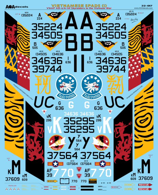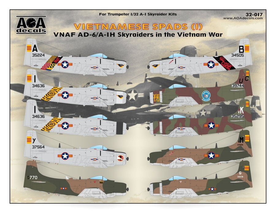 AOA Decals - 1/32 Vietnamese Spads (1) - VNAF Douglas AD-6/A-1H Skyraiders in the Vietnam War. Part 1 of the South Vietnam Air Force (VNAF) Skyraider coverage, this 1/32 decal sheet includes 10 marking options (depicting 8 aircraft).