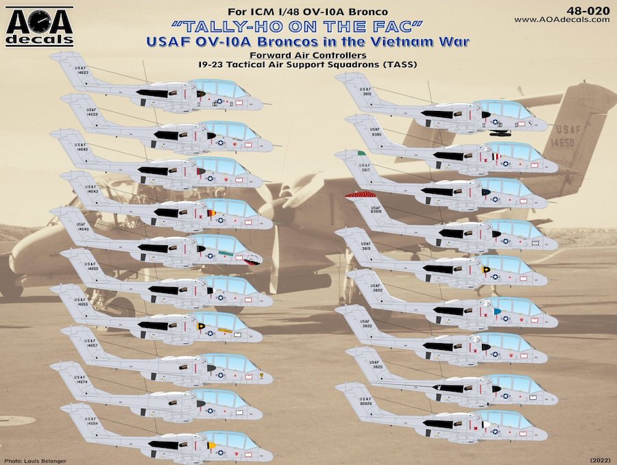 AOA Decals - 1/48 'Tally-Ho on the FAC' USAF North-American/Rockwell OV-10 Broncos in the Vietnam War. This 1/48 decal sheet includes 19 marking options for OV-10A Broncos used by the USAF in the crucial Forward Air Controller (FAC) role during the Vietnam War. Unfortunately, however, due to their generally nondescript markings, not all the schemes included are specifically identified to their applicable assigned Tactical Air Support Squadrons (TASS). One option included is a Pave Nail modified Bronco (with specific nose art), however, at the time of print, no Pave Nail kit or airframe conversion is known to be available.