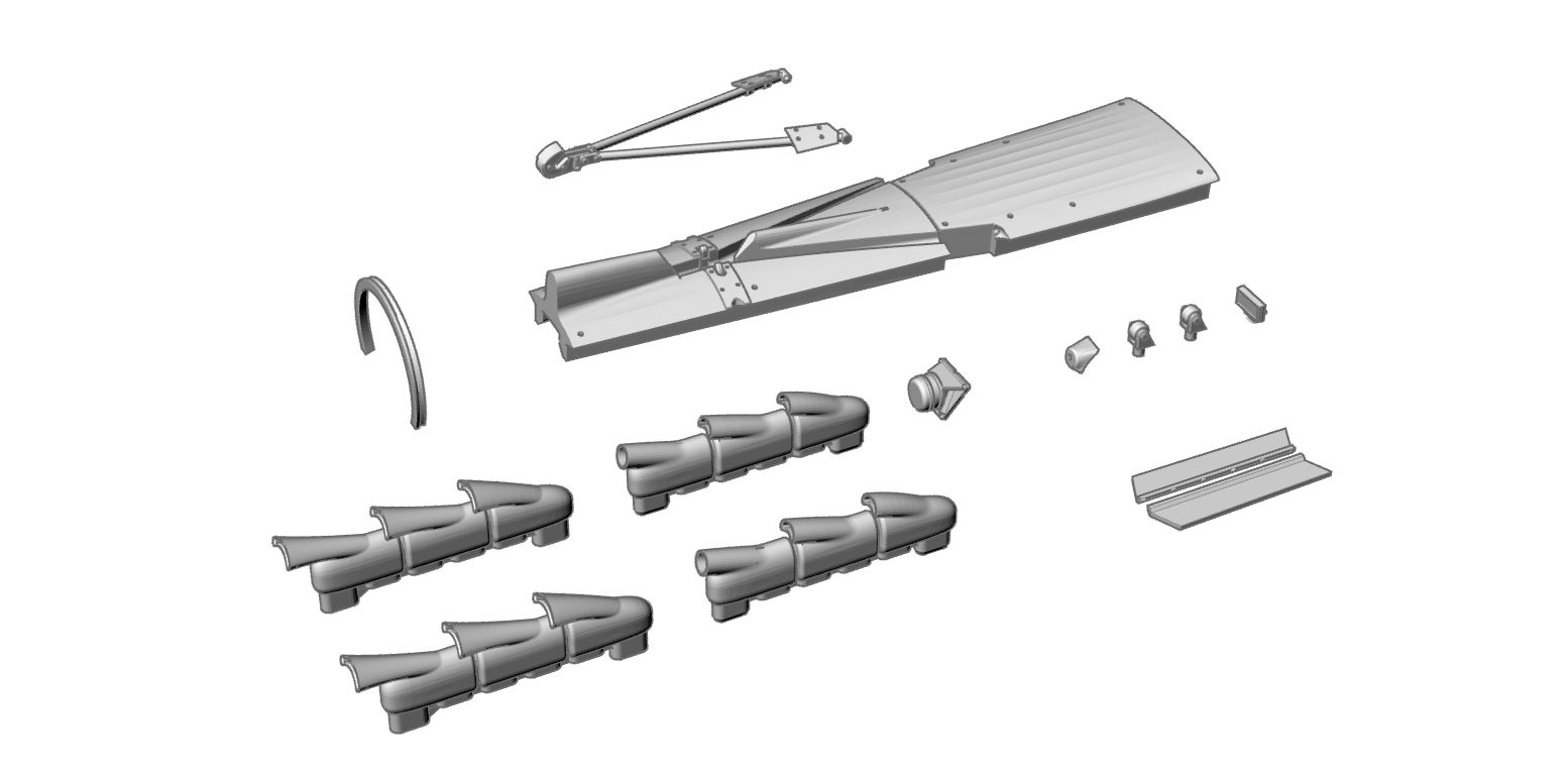 3D printed set with fuselage bottom, arrestor hook, exhausts (2 options), mirror, headrest, gun camera, oil collector ring, catapult spools and anti-glare exhaust shields.