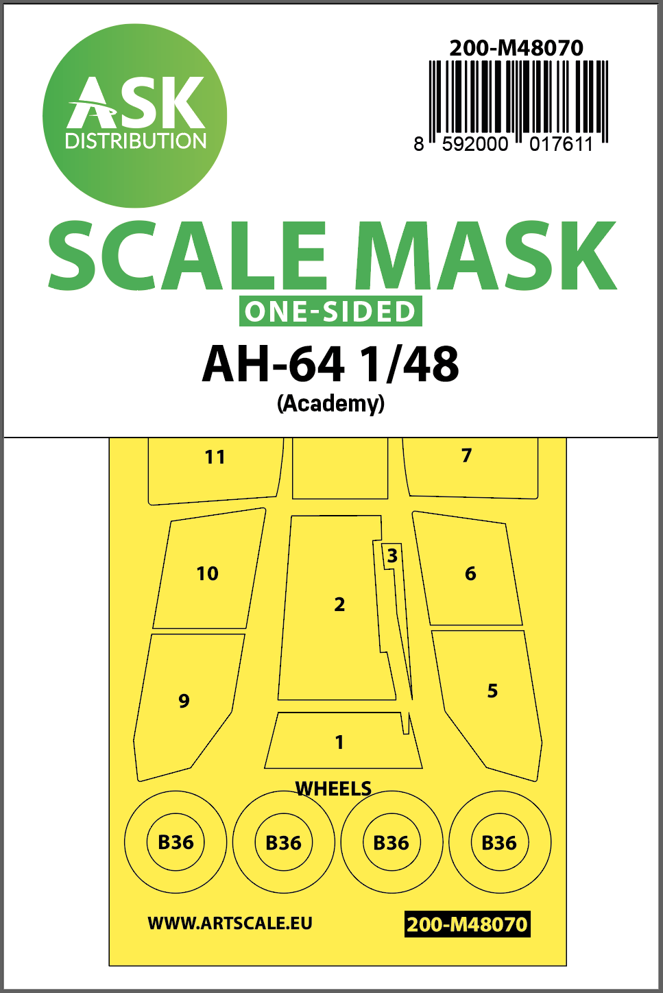 Art Scale - 1/48 Boeing/Hughes AH-64D Apache wheels and canopy frame paint masks outside only (for Academy kits)