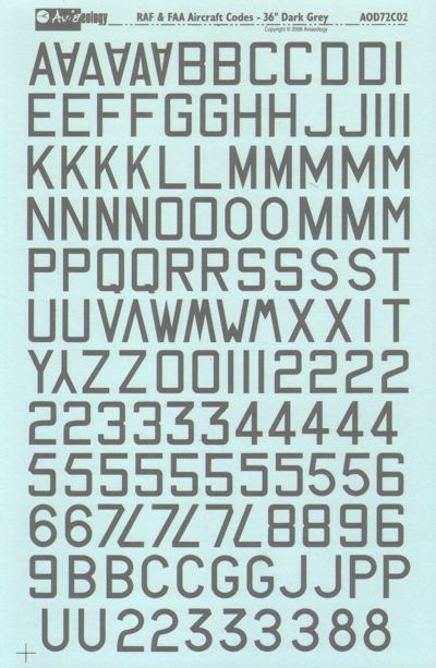 Aviaeology Abziehbilderbogen 1/72 für Flugzeugcodes der RAF und FAA in Dunkelgrau 36.