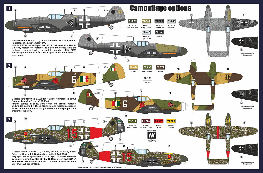 Retrowings by AZ Model - 1/72 Messerschmitt Bf-109Z-2 Night Fighter includes two Az Model kits, new injection molded frame with additional parts, canopy masks. Decals for Luftwaffe November 1944, Italian Air Force Milano Air Defence Flight 1944, Luftwaffe April 1945,