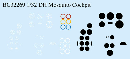 This sheet contains new, sharply printed gauge faces to replace the kit decal instruments, plus all of the many other stencils and placards found in the Mosquito cockpit. A simple and fun way to add a lot of visual interest to your Mosquito cockpit. [Mk.IX/XVI Mk.IV Mk.VI]