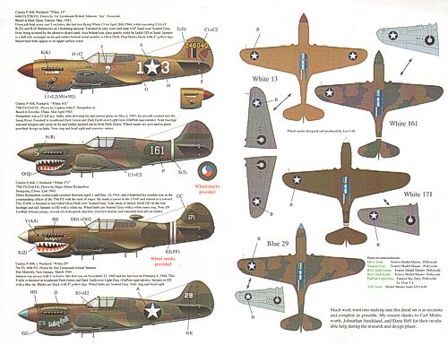 Barracuda Studios - 1/48 Curtiss P-40K Warhawks Pt 1 (4) 246040 White 13 64thFS, 57thFG Lt R.Johnson Jay Tunisia 1943, White 161 75thFS/23rdFG Maj Richardson China 1943, White 171 75th FS/23rd Fg New Guinea both with shark mouths, White 29 7th FS/49th Fg Patsy Ruth New Guinea