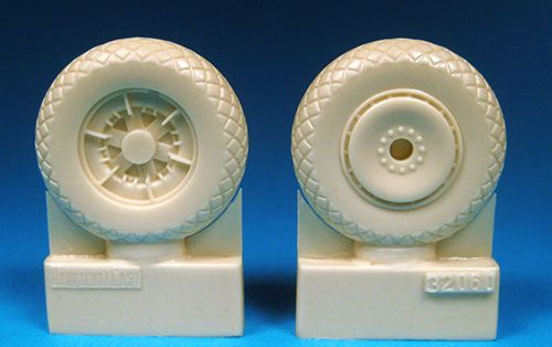 Barracuda Studios - 1/32 Republic P-47C/P-47D Thunderbolt Diamond Tread Main wheels. This set contains a pair of detailed resin mainwheels with crisply molded, seamless and accurate diamond tread pattern. You can choose between plain, covered or 6 slot hubs. The inner wheel hub detail is visible through the slots of the outer wheel hub, bringing a whole new level of detail. Makes a quick, easy and very visible upgrade. Designed to be used with Hasegawa, Trumpeter (whose wheels are just plain wrong) and Revell kits)