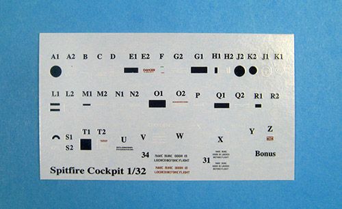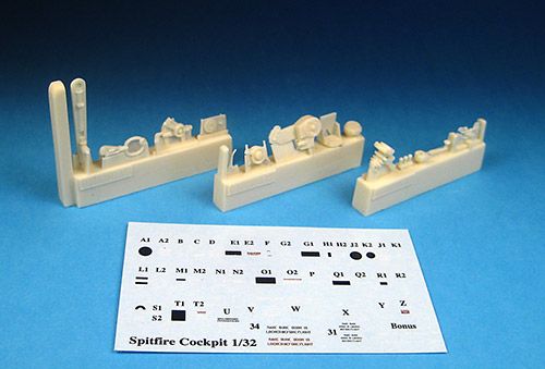 Barracuda Studios - 1/32 Supermarine Spitfire Mk.I-Mk.V Cockpit Upgrade Set This set contains a number of small detail parts to detail and accurize the cockpit in the new Supermarine Spitfire Mk.IIa. Parts include a new 3 part stick, gunsight, throttle, retract quadrant, remote contactor, compass and mount, canopy latch and early style radio selector. Also includes a sheet of cockpit stencil decals. (designed to be used with Revell kits) Master patterns by Roy Sutherland.