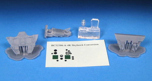 Contains all the (mostly 3D printed) parts to convert the A-4E/F into a Rnzaf Kahu. Cockpit upgrades include a new, modern instrument panel with multi function displays and instrument decals, a new throttle and stick top, rudder pedals, and gunsight with clear cast Hud glass. New external details include a new fin top, a number of blade antennas, early and late parabrake housing, cooling intakes and a clear cast high intensity strobe light.. Designed for the Trumpeter A-4E or F kit, but can be modified to fit the older Hasegawa Skyhawk. Master patterns by Kerry Carlyle and Mike Swinburne. Research assistance from Craig Sargent and Anthony Galbraith (for Trumpeter kits)