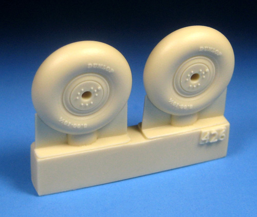 This set contains a pair of resin cast accurate mainwheels, featuring fine tire beading, readable tire data, and a superdetailed wheel hubs with separate uplock lugs. Designed to replace the sometimes poor wheels found in 1/32 Hurricane kits. A fast and easy upgrade (for Fly and Pacific Coast)