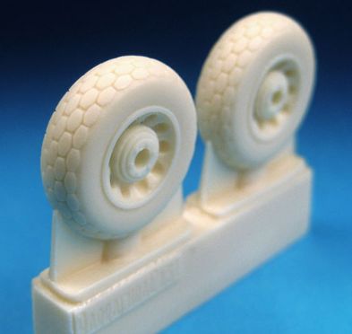 Barracuda Studios - 1/48 North-American P-51D Mustang Hexagonal Tread Wheels. Accurate resin hexagonal tread pattern tires/tyres with see-through hubs replace the kit wheels in any 1/48 kit of the A-36 and North-American P-51A, P-61B Black Widow, P-51C, P-51D and P-51K variants. You can see daylight through real Mustang wheel hubs. Now you can recreate this in 1/48th scale.