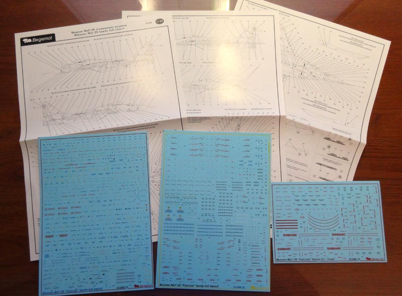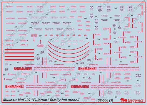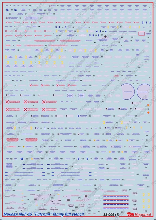 Begemot - 1/32 Mikoyan MiG-29 Fulcrum stencil 1/32, full decal set for aircraft and armament. Include stencil for standard grey-green camouflage and also for four-tone low altitude camouflage. [MiG-29A MiG-29C MiG-29UB]