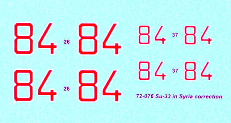 Begemot - 1/72 Sukhoi Su-33 in Syria. Su-33 from Soviet Naval Aviation in Syria. 10 markings scheme any Su-33s aircraft, which took a part in Admiral Kuznetsov carrier mission in Syria. In decal include insignias, board numbers, badges and mission marks.
