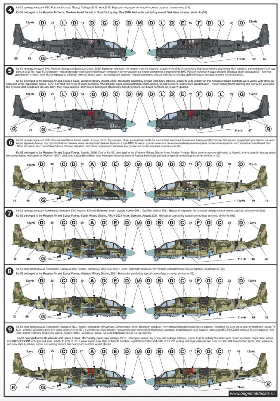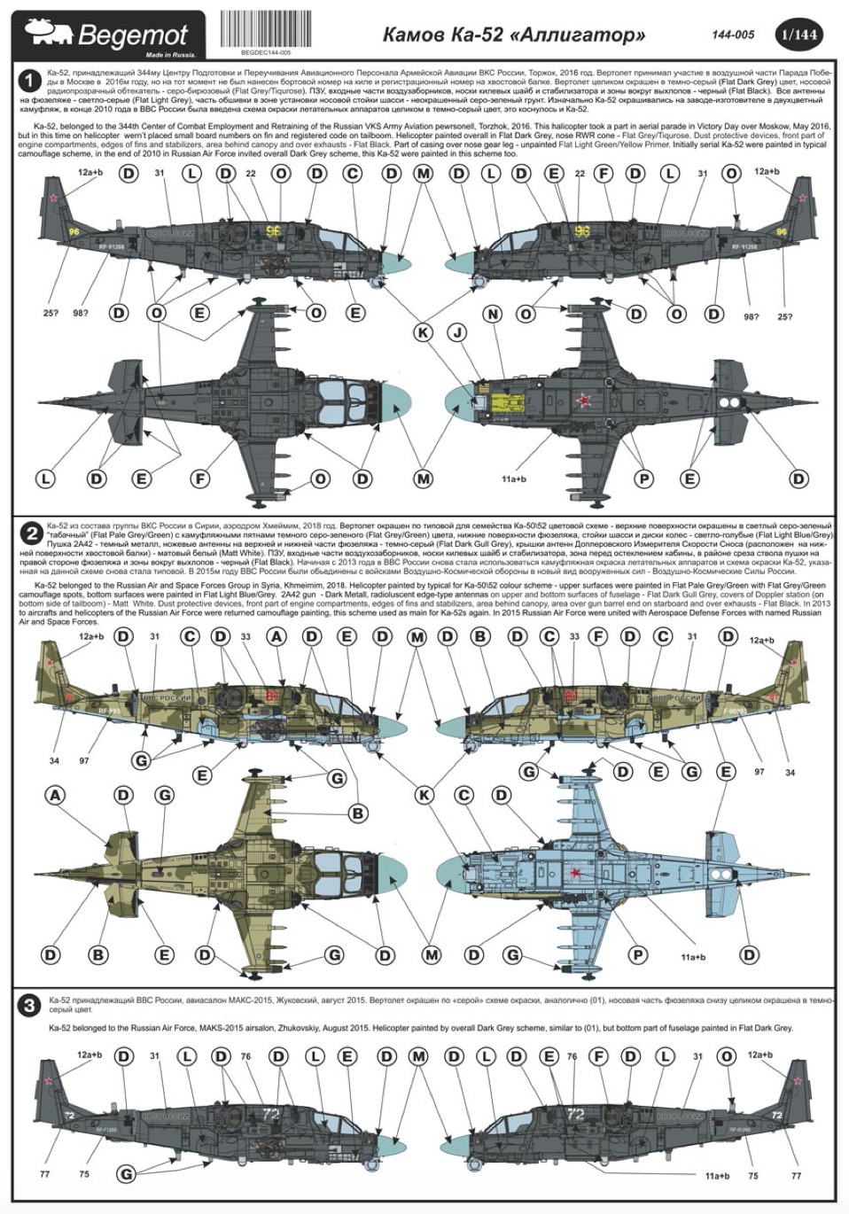 Begemot - 1/144 Kamov Ka-52 Alligator Decal with opportunity make 26 marking variations of Ka-52 Alligator family helicopter all types, from Russian Army Aviation. Including one small size decal and 6-pages instruction A3-size instruction.