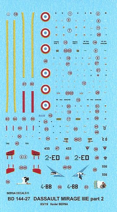 Berna Decals - 1/144 Dassault Mirage IIIE Armée de l'Air Part 2: 2-ED N 433 EC 1/2 'Cigognes' BA 102 Dijon 1975, 4-BB N 556 EC 2/4 'La Fayette' BA 116 Luxeuil 1979.
