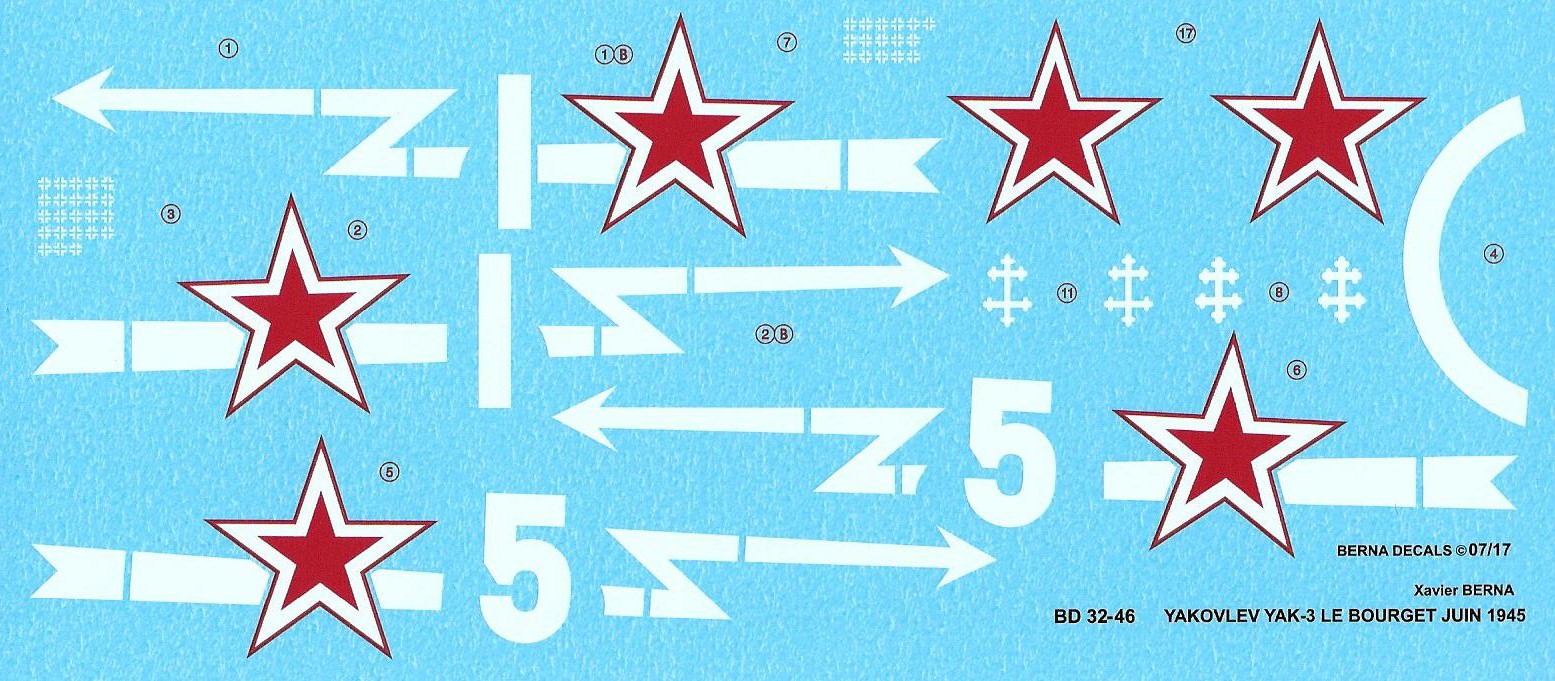 Berna Decals - 1/32 Yakovlev Yak-3 Normandie-Niemen: n 1 Cne Marcel Albert 20/06/1945, n 5 S/Lt Roger Sauvage 20/06/1945.
