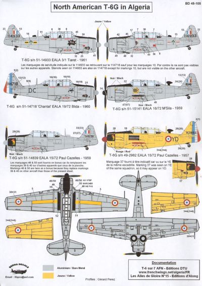 Berna Decals - 1/48 North-American T-6G French in Algeria : 51-14933 of Eala 3/1 'Air Pluto & Wasp' in 1961, 51-14718 of Eala 19/72 'Black Scorpion' in 1960, 49-2982 & 51-14839 of Eala 15/72 'Osprey' in 1957 & 1959, 51-15141 of Eala 16/72 'Viper' in 1959
