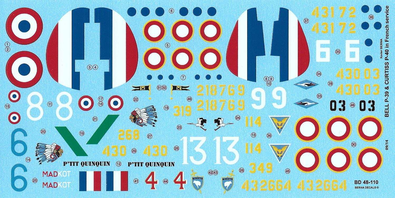 Berna Decals - 1/48 Bell P-39 'Limousin', 'Navarre', 'Travail' & 'Auvergne' (5 schemes) and Curtiss P-40 'Lafayette' (3 schemes) in french service