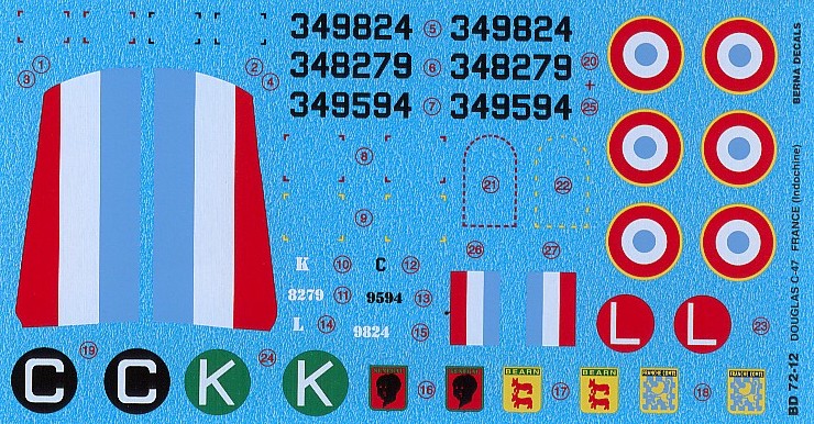 Berna Decals - 1/72 Douglas C-47 Dakota 3 GT2/62 `Franche-Comte' Tonkin 1953, GT2/63 `Senegal' Nam Dinh 1954, GT1/64 `Bearn' Tan Son Nhut 1953