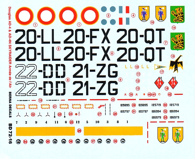 Berna Decals - 1/72 Douglas AD-4 and AD-4N Skyraider 5 20-FX EC1/20 Bone 1961, 22-DD EAA2/21 Ivato 1965, 20-QT EC2/20 Boufarik 1961, 20-LL EC3/20 Oran La Senia 1961, 21-ZG EC1/22 Fort-Lamy 1974. All painted aluminium
