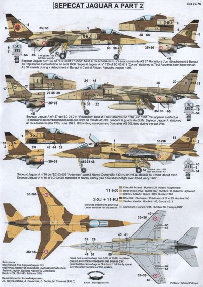Berna Decals - 1/72 Sepecat Jaguar A Part 2 : 11-ES n.A157, Toul-Rosieres June 1991,18 bombing missons and 3 missiles As 30L fired during the Gulf War; 11-RJ n.A135, Toul-Rosieres seen with an As 37 missile during a detachment in Bangui (Central African Republic) in august 1986; 3-XJ n.A16, Nancy-Ochey seen in flight over Chad, early 1987; 11-RK n.A149, Toul-Rosieres seen at Nellis Afb (USA) during a Red Flag exercise in March 1990 with a four-tone camouflage & 11-YH n.A96 Bordeaux-Merignac 07/1992 (special scheme "Serpentaire" for the disbandment of 4/11 "Jura")